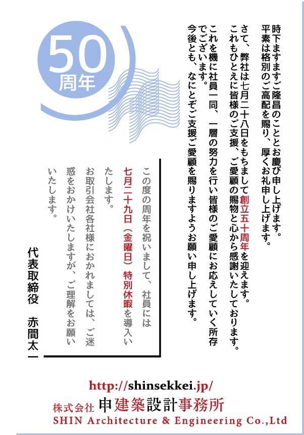 半世紀である記念すべき50周年を迎えるにあたりコロナ禍が未だ終息しきらない状況を踏まえ、直接の感謝をお伝えする機会は少し先に延ばそうと考えておりますのでご了承ください。